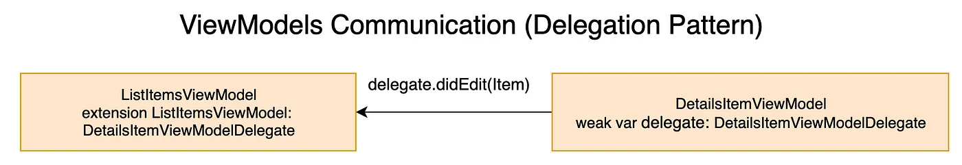 예를 들어, _ItemsListViewModel_과 _ItemEditViewModel_이 있다고 가정해보겠습니다. 먼저 ItemEditViewModelDidEditItem(item) 메서드가 있는 ItemEditViewModelDelegate 프로토콜을 생성하세요. 그리고 _ItemsListViewModel_이 해당 프로토콜을 준수하게 하세요.