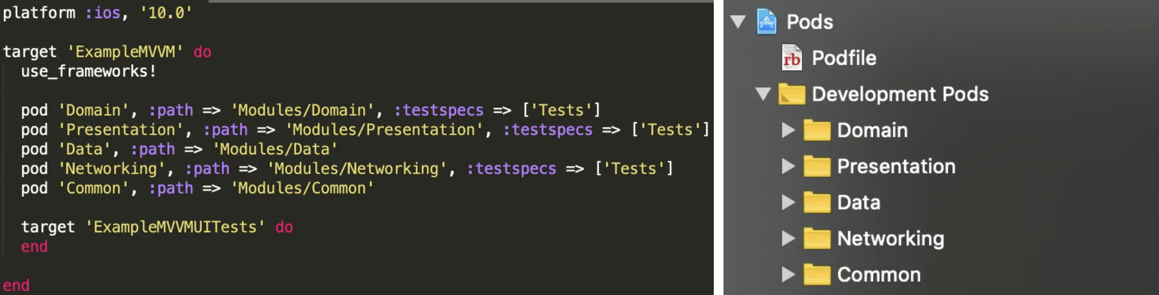 그리고 _CocoaPod_을 사용하여 해당 프레임워크를 메인 앱에 포함시킬 수 있습니다. 이러한 작업 예제를 보려면 여기를 참조하세요. Note: 권한 문제로 인해 ExampleMVVM.xcworkspace를 삭제하고, pod install 명령어를 실행하여 새로운 워크스페이스를 만들어야 합니다.